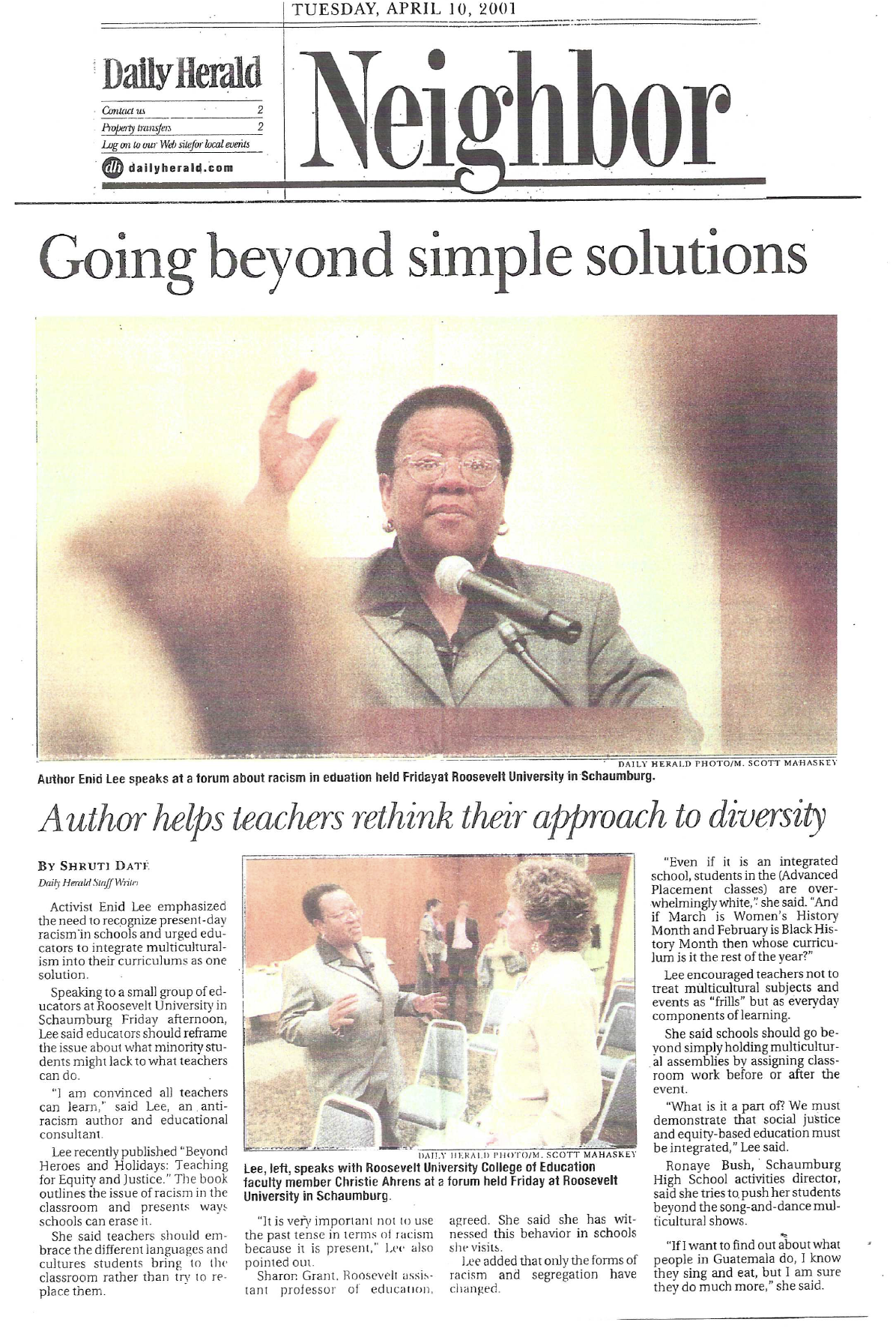 Going beyond simple solutions: Author helps teachers rethink their approach to diversity / Daily Herald / April 10, 2001