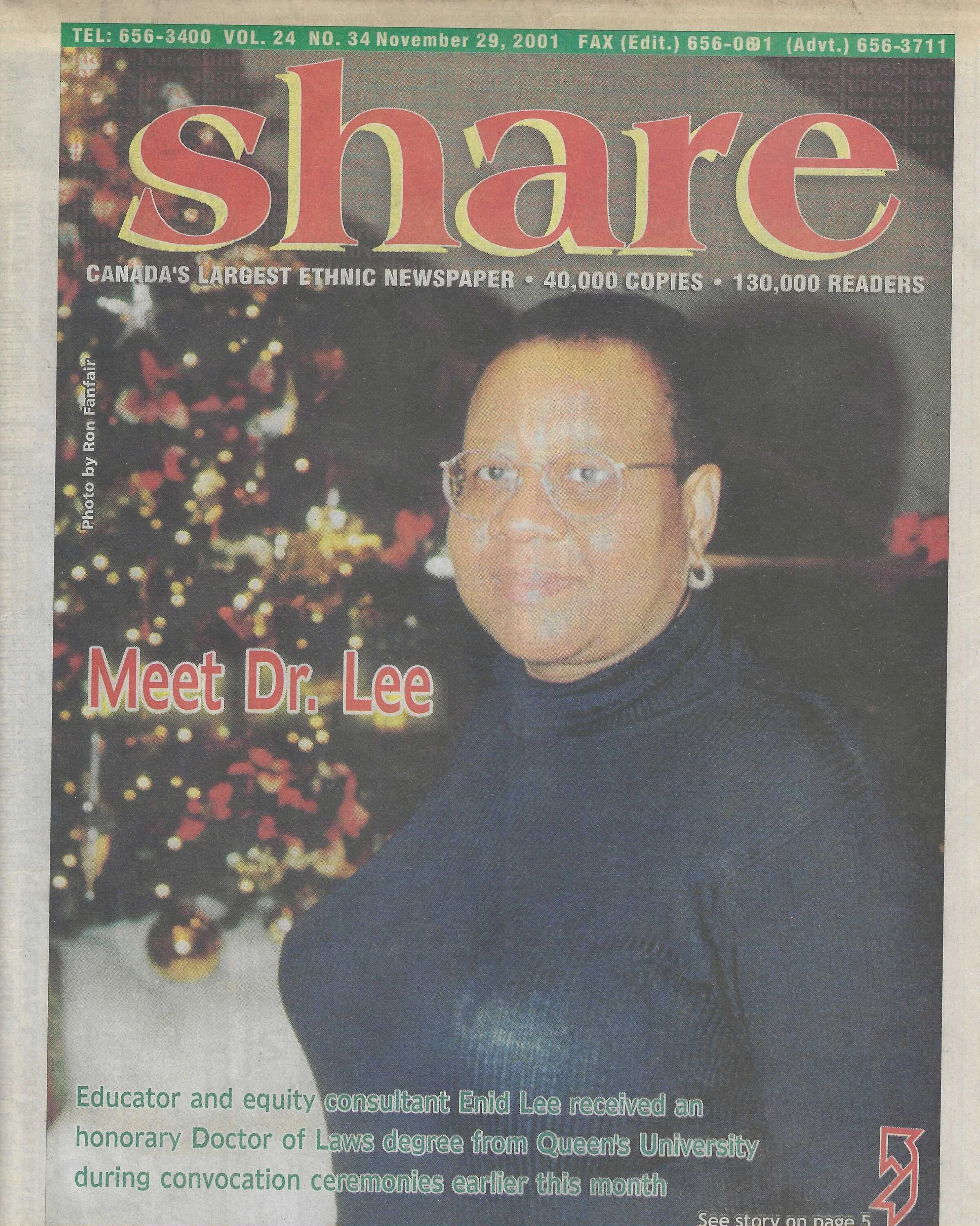 Enid Lee on the cover of Share, Canada's largest ethnic newspaper / November 29, 2001