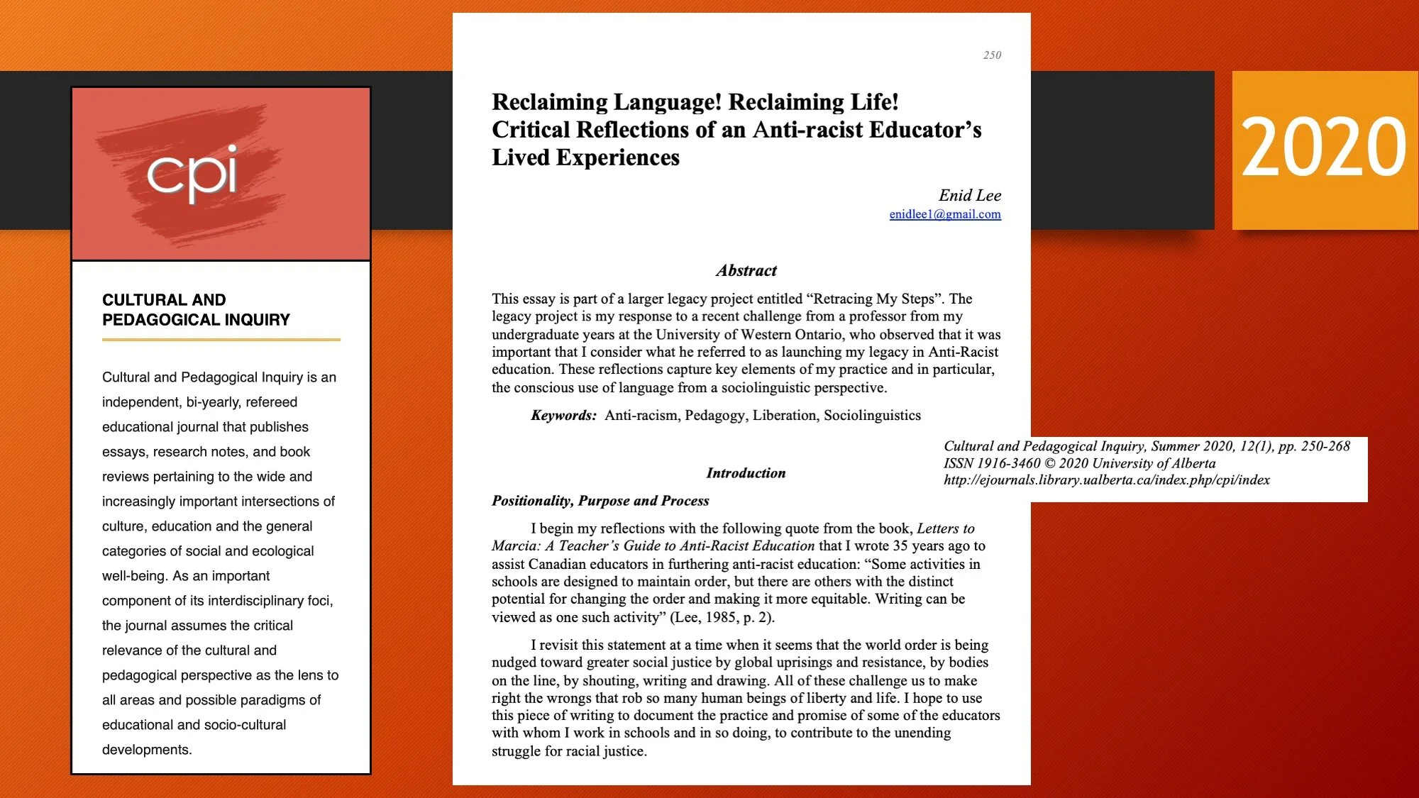 Cultural and Pedagogical Inquiry, Summer 2020