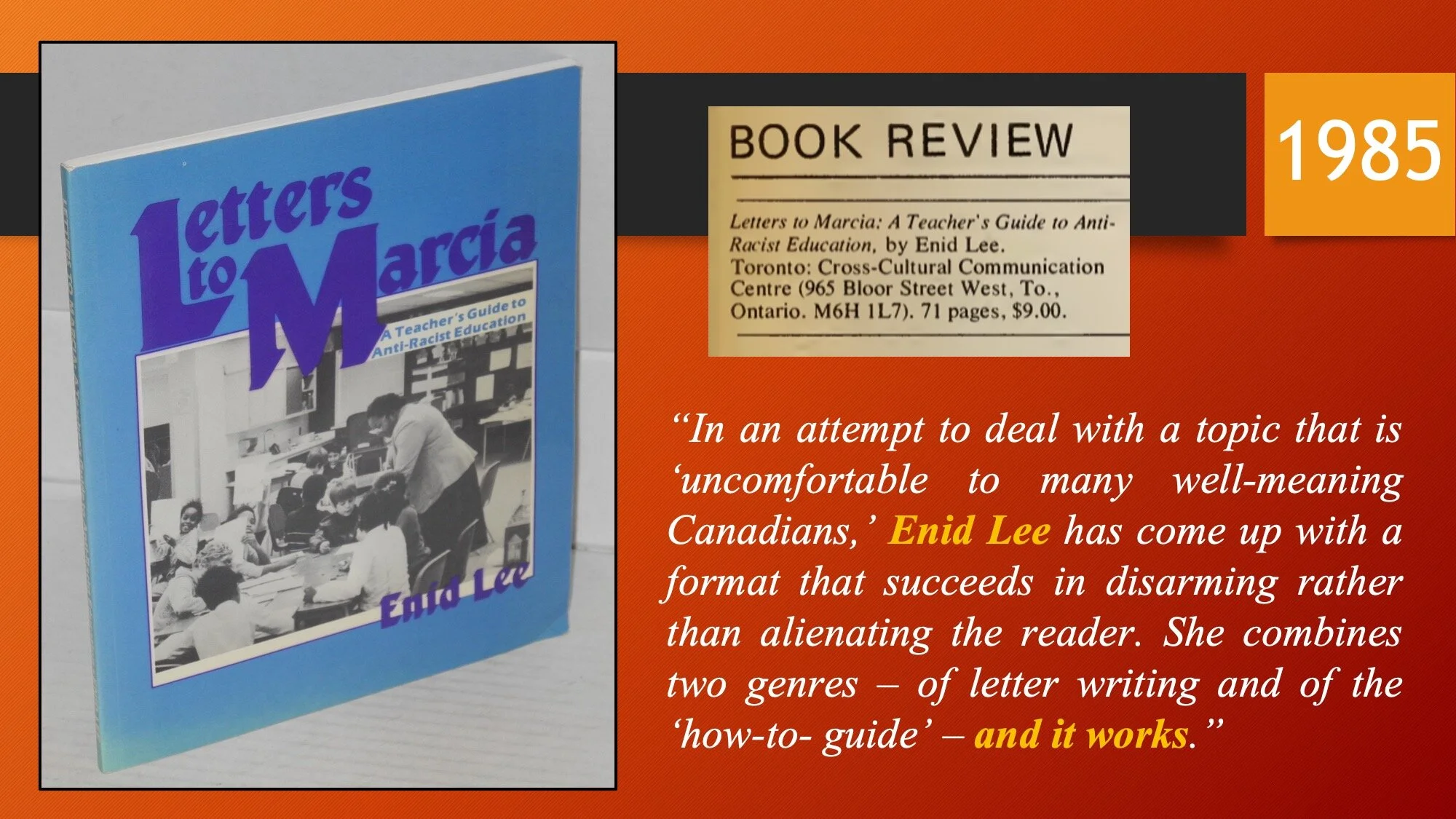 Enid Lee is the author of over 30 publications. They include Letters to Marcia: A teacher’s guide to anti-racist education, the docudramas, “Quick to Judge” and “Food for Thought” from the television series, “Many Voices,” and Beyond Heroes and Holidays: A Practical Guide to K-12 Anti-Racist, Multicultural Education and Staff Development. She also contributed to many other books including Rethinking our Classrooms and Mentors in the Making.